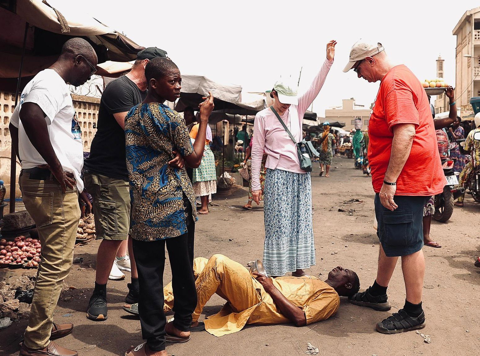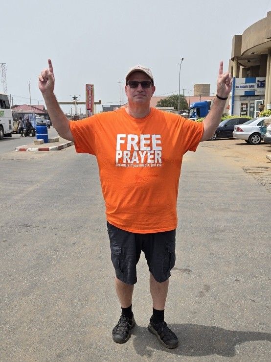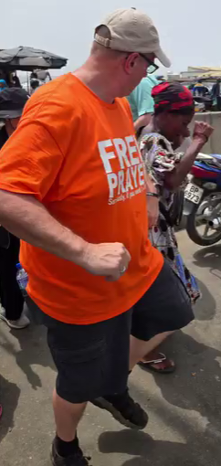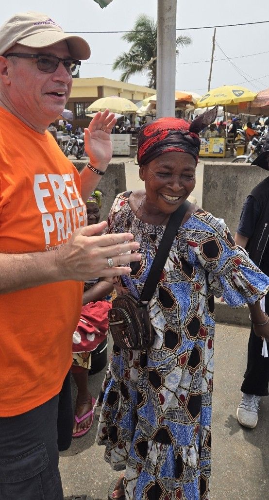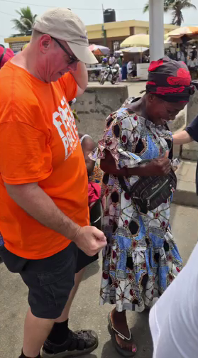 While praying in a market near the Ghana border. Colby Smith and MeeLi and I were praying for people with our translators. Momma was across the street and kept waving at me nonstop. I put up one finger in air in an attempt to let her know I see her and would be over there shortly. Next thing l know a young man was tapping me on the shoulder and said my momma wants prayer. I told him I was waiting on the translator to finish. He said I speak English and will translate for you. So while Colby was finishing praying I walked across the street. Momma pointed to cast on foot. I place my hands on her foot and commanded it to line up with the finished work on the cross. She said pain was gone. I asked her to stand up on it. She could stand but still a little pain when walking. I laid hands on foot again. This time all pain gone and started marching in place. I told her the Jesus had just made himself known to her. She was ready to accept Him as her Lord and savior. After leading her through confession, she started telling everyone the Jesus healed her. I motioned Colby and MeeLi to come across the street. We ended praying for 4 people with knee pain. Jesus touched and healed each of them! And of course, Momma wanted to finish it with a dance party.